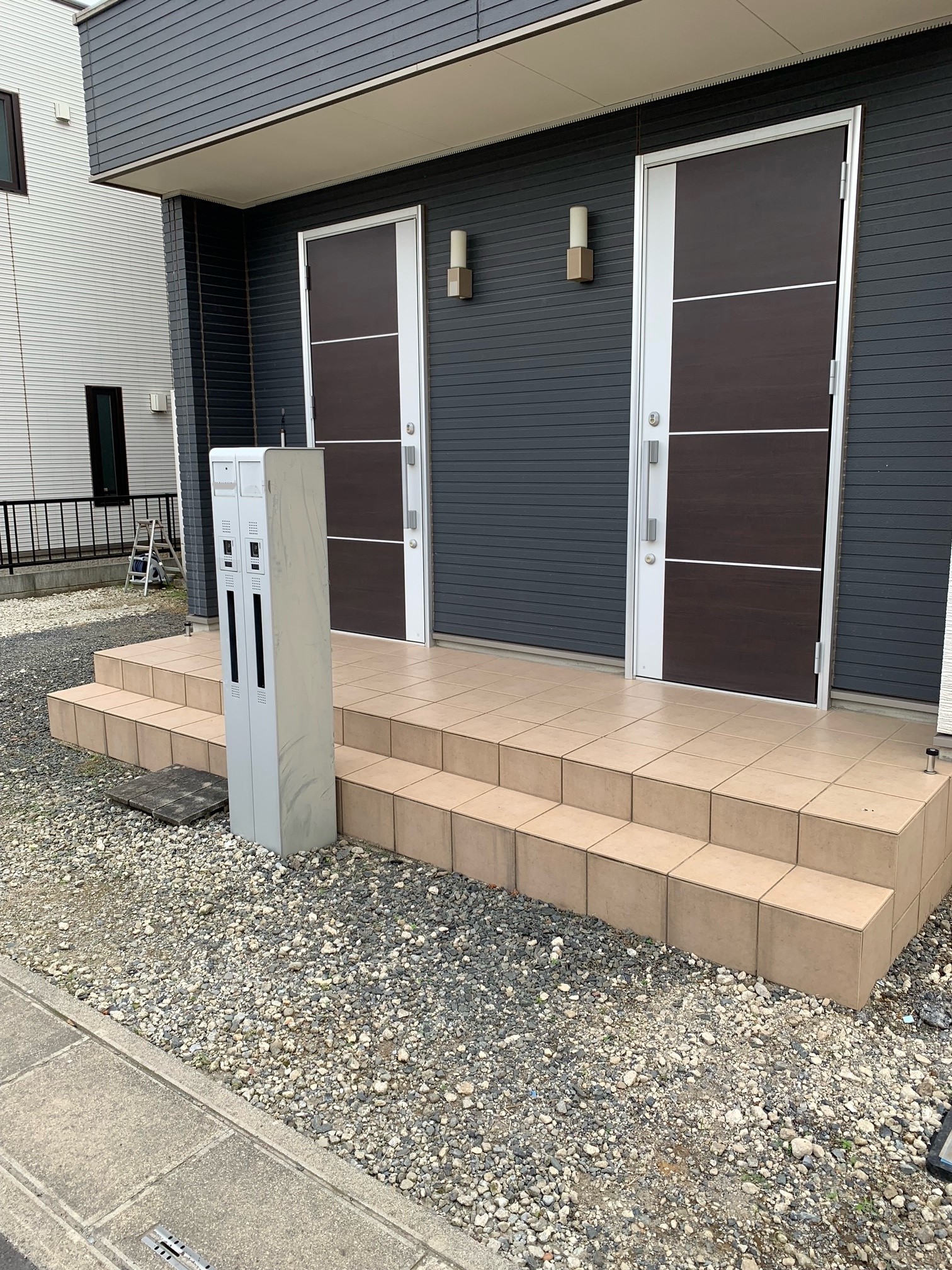 二世帯住宅のお家で玄関前はポーチ・機能門柱は既にある状態でした。