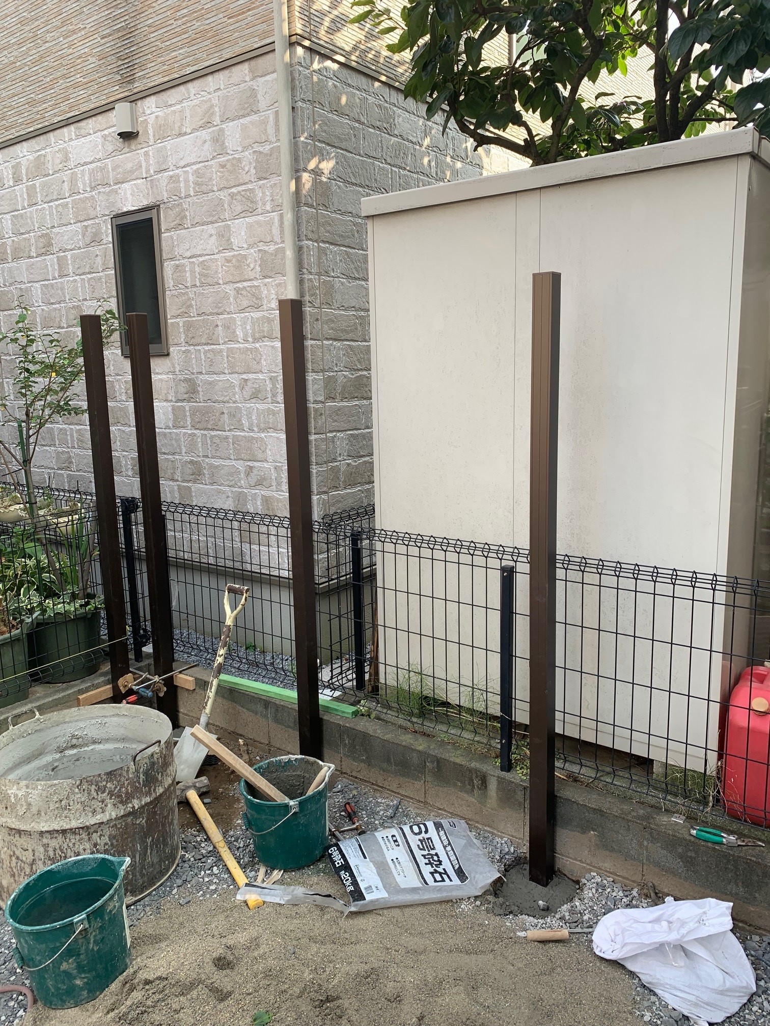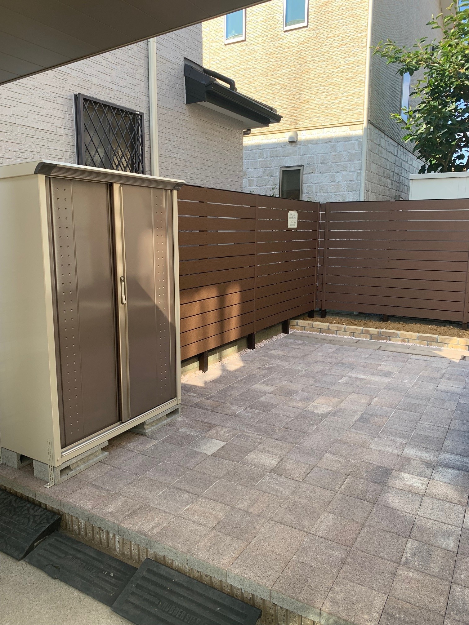 まずは目隠しフェンスを建てて行き、床はインターロッキングブロックで仕上げて